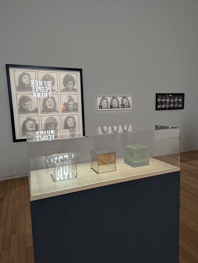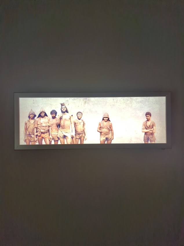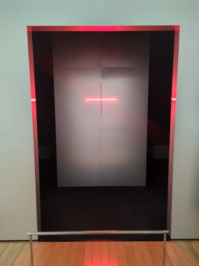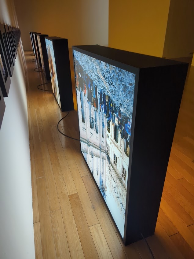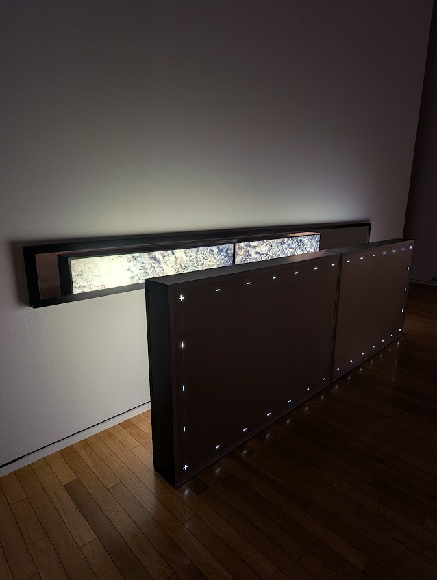 展示のしかたが特徴的で、写真のライトボックスを壁側へ向け、壁に埋め込まれた細長い鏡に映った像を、観客が近づいてのぞき込んで見ます。