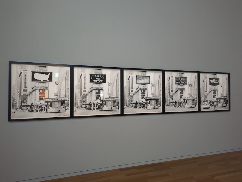 星条旗と日の丸が描かれたライトボックスが上下に向かい合う形で置かれ、日米の関係を考えさせる構成になっています。