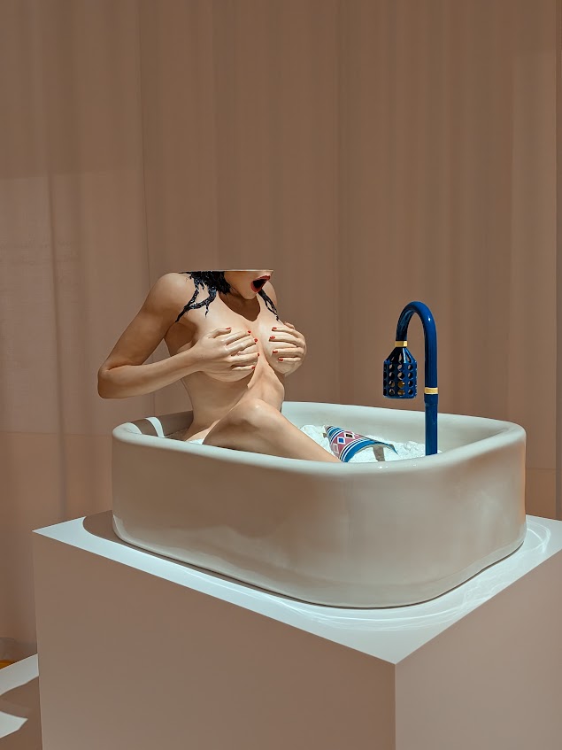 テーマは、美術史で繰り返し描かれてきた「浴室/入浴図」ですが、クーンズはそれを「気まずさ」で表しています。