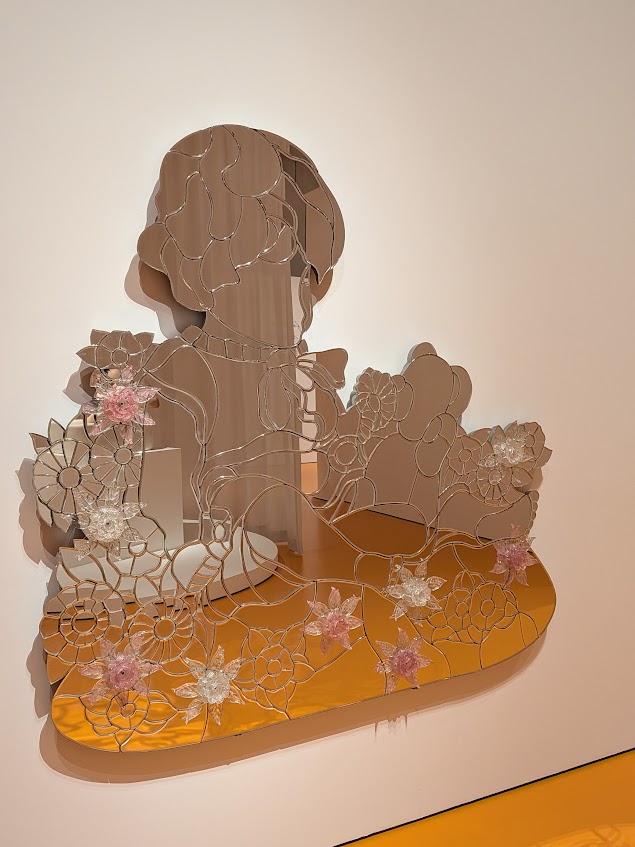 ムラーノ島の工房の協力で、複雑なガラス装飾(花)をまとった大きな鏡が作られ、そこに無邪気な図像(テディベアや花束を抱えた少女)が共存しています。