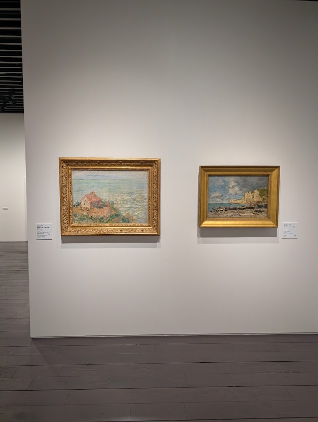 コローやブーダンといった少し前の世代の画家と並べ、モネが自然主義的な風景画から、独自の表現へ進んでいったことがわかります。