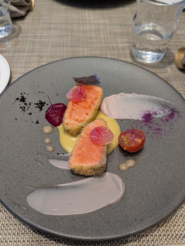 メインはコラボの「サーモンのレアカツレツ仕立て サフランのバターソース」