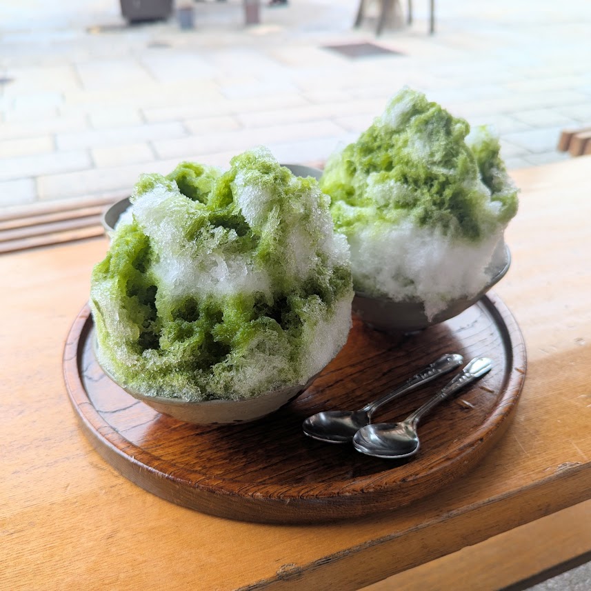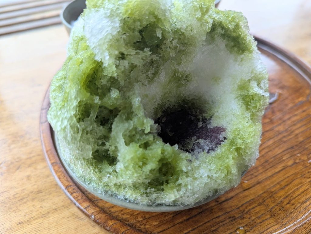 抹茶のかき氷の中に、あんこと餅が2つ入っています。おいしい。