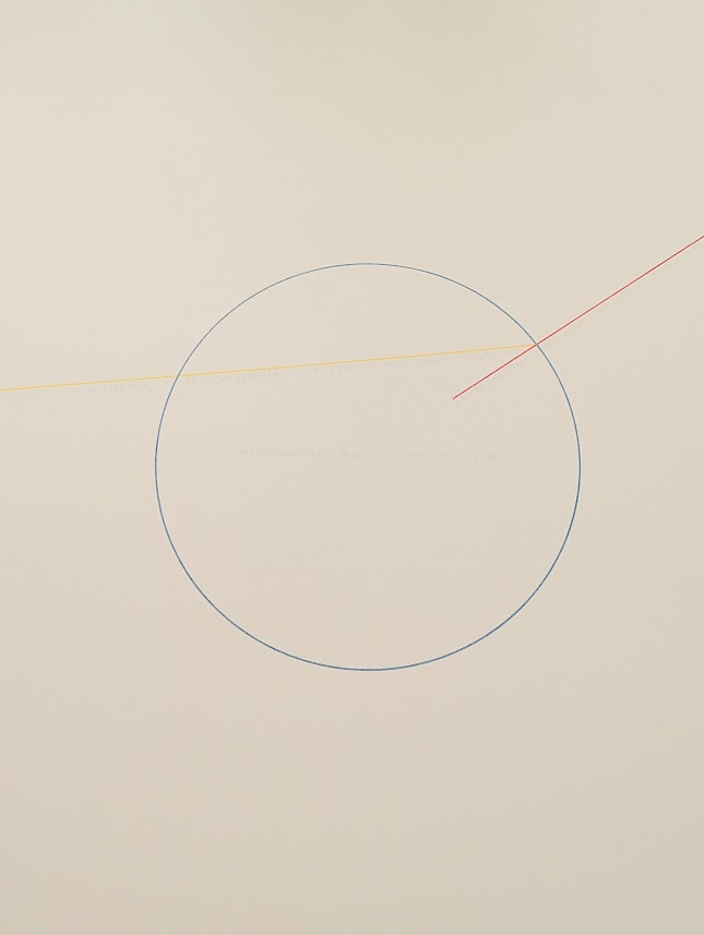 壁に、青い円と赤と黄の直線を、決められた位置関係で配置する作品です。