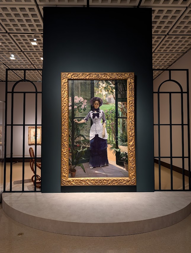 フランス窓から温室に一歩踏み入れる夫人プロスペリエを正面から。古典的なポーズや衣装は格式を感じさせますが、色の置き方は印象派風の明るさ。内でも外でもない半室内の魅力を大画面で伝えます。