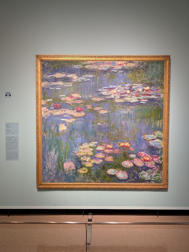 モネが晩年に取り組んだ「睡蓮」連作の一枚。岸も空も描かず、水面そのものだけに集中しているのが特徴です。近づくと重なった絵の具の肌が見え、離れると静かな池の広がりが現れます。これは実業家松方幸次郎が直接画家から手に入れた作品で、日本に伝わる重要な一点です。