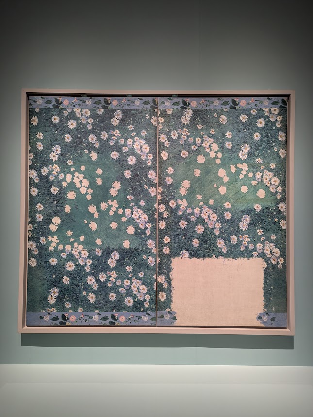 この作品は、カイユボットが自宅のために構想した室内装飾です。壁面を連続するパネルで覆い、白いヒナギクが点在する芝生をぐるりと描いて、部屋そのものを花壇の中のように見せます。生涯の後半に庭づくりに熱中したカイユボットらしく、絵画と庭のあいだを直接つなぐ試みでした。作品は未完で、後にパネルが切断されましたが、2016年に市民募金で収蔵・修復され、本来の連作として再統合されています。