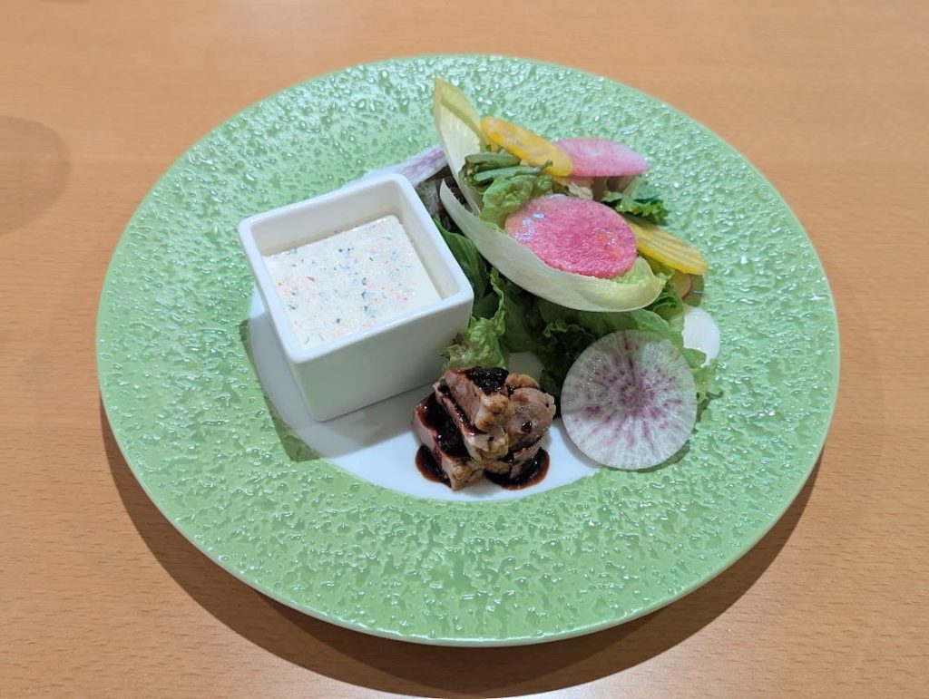 上にのっている赤い四角、絶対にブロックベーコンだと思ったのにラディッシュ?野菜でびっくりした。