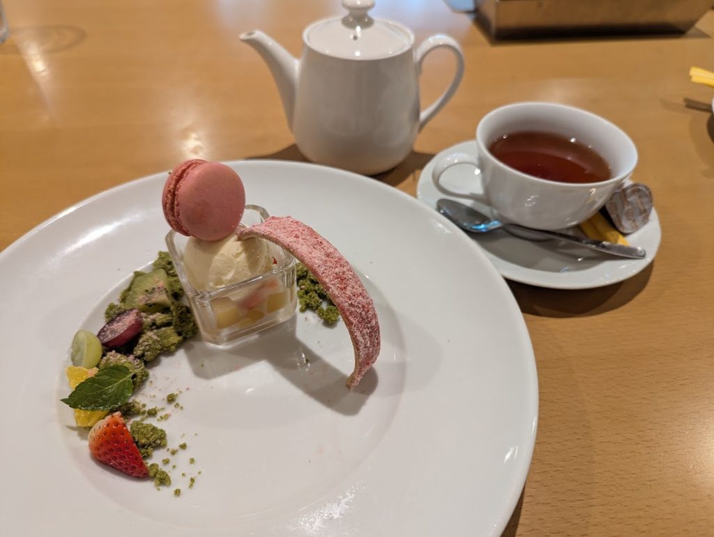 りんごとカルヴァドスのカラメリゼとバニラアイスと紅茶。コーヒーも選べます。