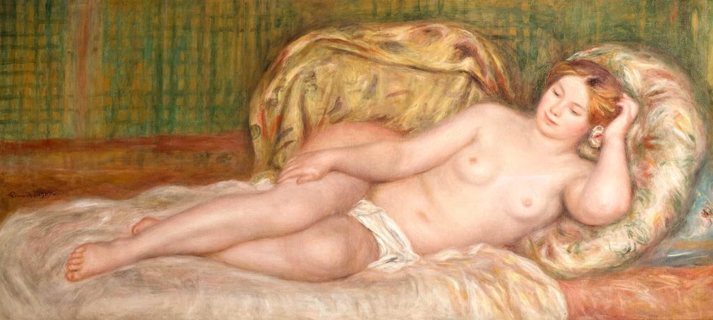 ルノワールが追い続けたテーマのひとつが、豊かなからだの曲線をもつ裸婦です。この作品では、横たわるポーズという伝統的な主題を取りながら、やわらかな色づかいで肌の質感と量感をていねいに表しています。19世紀の画家ティツィアーノやルーベンスの流れをふまえた、おだやかで気品のある大作です。