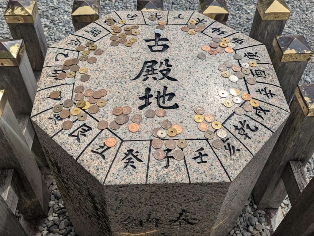 拝殿正面の方位石(古殿地)。かつてご神座があった特別な場所で、八角形の石に方角が刻まれています。