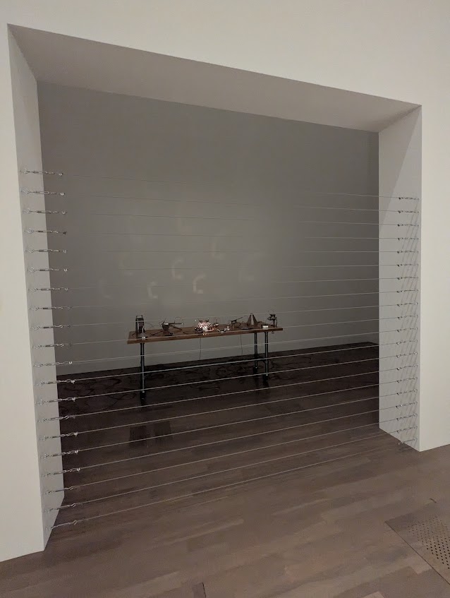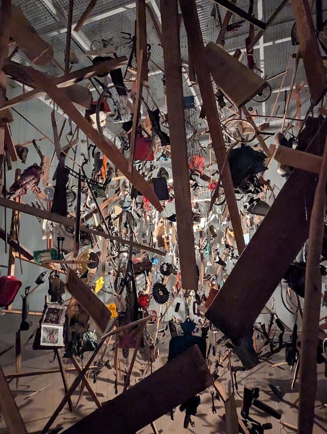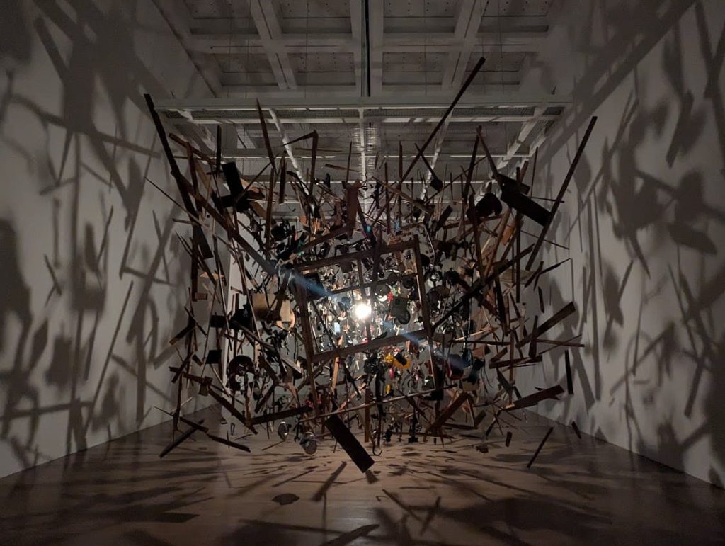 作家が英国陸軍に物置小屋の爆破を依頼し、残骸を拾い上げ、照明を落とした密閉空間の天井から吊るし、中央に強い光の電球を置いた作品です。